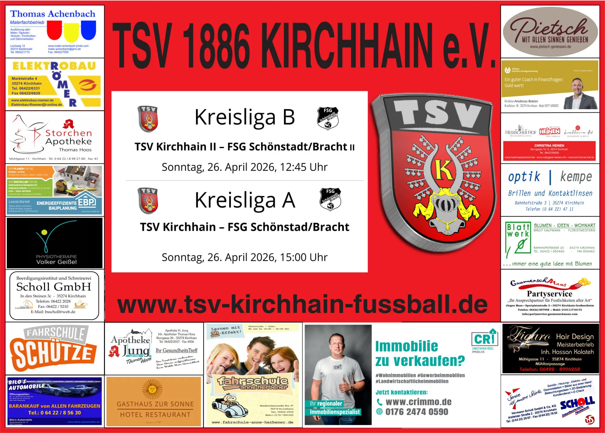 Erreichen Sie fußballbegeisterte Zuschauer direkt vor Ort, mit Ihrer Werbebotschaft auf unserer LED-Videowand beim TSV 1886 Kirchhain! Jedes Heimspiel zieht lokale Fans auf unser Sportgelände, eine ideale Zielgruppe ... [mehr]