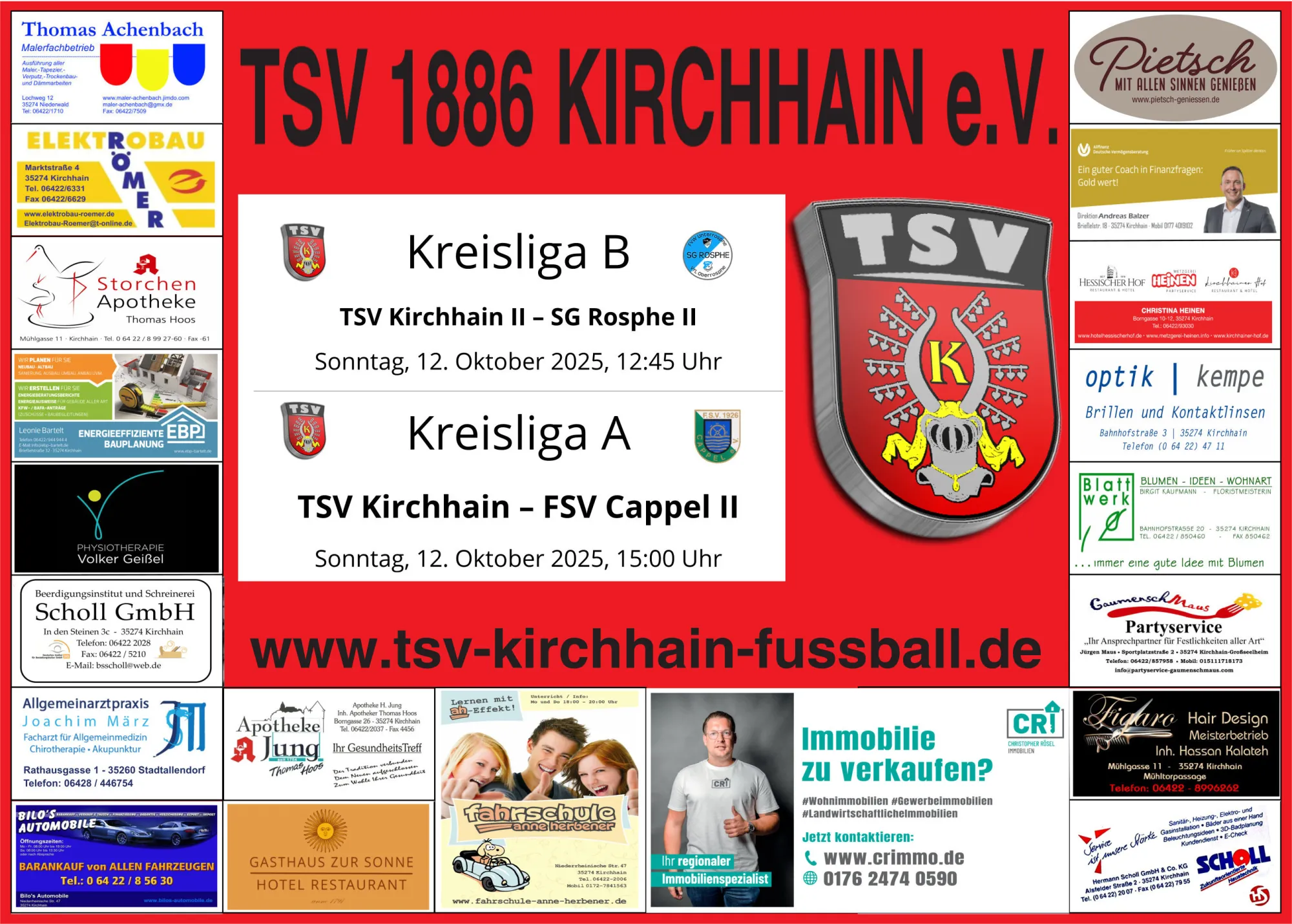 Am komenden Sonntag spielt unsere 2. Mannschaft um 12:45 Uhr gegen die SG Rosphe II und um 15:00 Uhr empfängt unsere 1. Mannschaft den FSV Cappel II. Wir freuen uns über jede Unterstützung.